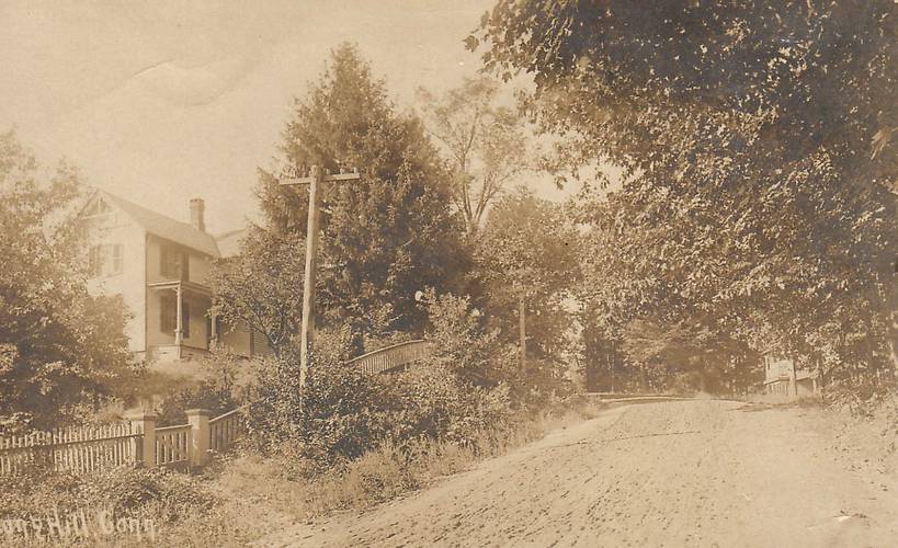 A very nice, quaint home with an old fence in front also is seen on along this dusty New England road....