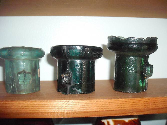 I got these three LRIs along with a few more from a Craig's List tip. The group also had some glass and porcelain pin types and some misc items. The LRI on the left is a somewhat uncommon Side Tab style with a rather big tab. The middle one is embossed: Hickock's Patent/ 1859. It is in the usual dark green color. The one on the right is a crude oldie with no embossing. I have always liked these no name Side Tab styles, especially in deep green color. |