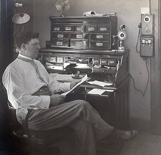 Nowadays the approximate equivalent within this scene would be a flat screen monitor, a couple cheap curly-cue compact fluorescent lights with a cell phone (and/or flimsy electronic office bird-chirping telephone), sheet-toe table fans that hardly endure spinning more than one summer season, an IKEA desk (or its pressboard equivalent) that would not last more than a few years...etc! Unfortunately all of this s*** seems to be the business standard and of course made in China. Everything you see in this photo from 100 years ago was without doubt was made in the USA and built with long-lasting pride. Were things better and simpler in 1912? |