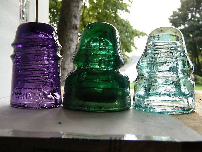 Was told a few other insulator collectors had been through the bottle show held in Poughkeepsie NY last Sunday. They were nice enough to leave these three behind for me. Was pleased when I decided to walk to where the light was better with the PRR CD 162.5. The light was so bad that I thought it was either your everday aqua or dark blue aqua. Turned out to be green and my favorite purchase. Has two just under a dime size bubbles, am anber swirl passing through the dome and junk. Very nice charector. All three I puchased from the same seller and a very decent prices. He had many others and now I regret not buying more or making him some offers on others. He pretty much went along and let me name my own cheap price on this group. |