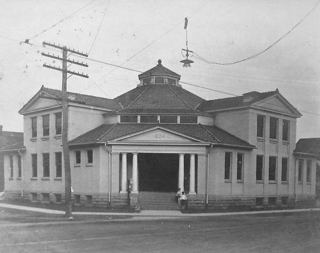 Note that this span-wire street light fixture has several lightbulbs clustered within it. This was a fairly uncommon street lighting practice since it was more economical to use a single, larger lamp. At any rate, I bet this fixture looked priceless at night especially when illuminating the snow in the winter. A four-crossarm, 10-pin telephone open wire pole proudly stands in the background ;-) Added note: That is a pulley that is mounted above the fixture. Its purpose was for conveniently (and safely) relamping the fixture, lowering it to the ground for maintenance. A winch on a nearby pole controlled this maneuver. Many arc lights were installed with this provision. It is very possible an arc light once existed here and was replaced by this fixture employing incandescent bulbs. The latter lasted longer and were a bit more energy efficient. |