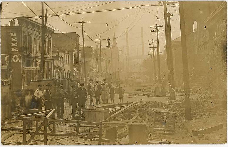 Note the "pipe bracket" two-pin fire alarm telegraph line atop the poles along the left. Beneath were telephone circuits. There might have been more crossarms on the poles along this line, given the possibility the paired cable strung below the 10-pin arms replaced a lot of phone openwire. Along the right are electric distribution circuits. Plenty of repair work is needed here! |