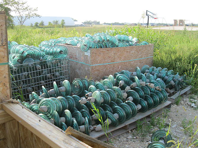 The job I am currently on we are removing some 161 kv H frames for a new single steel pole double circuit with 345 and 161 kv. and here is about 1500 green glass that has been removed so far. I will be taking a few of these home.