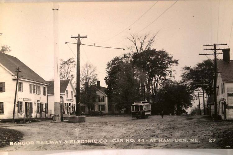The street light circuit that operated this arc light (barely visible...) is seen on the left. Often these fixtures were mounted on a horizontal "boom" or "mast arm" from its wooden pole. In these instances there was a winch at around eye-level on the pole that allowed the lineman to lower the fixture to ground-level for maintenance. When arc lights were gradulally replaced by more energy-efficient incandescent (tungsten) street lights commencing in the teens, often the same luminaire was retained with a provision for a socket for the incandescent light bulb. A nice openwire phone line is also seen along the right ;-) |