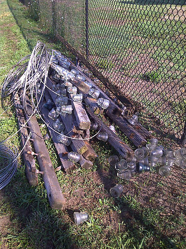 A section of pole line is coming down over the next couple weeks, and I will be keeping a close eye on it most days. It is not going to yield anything great, but you never know what little nuances you may find. I have scooped up quite a few sage 40s already, as well as a dozen cool looking dead end brackets. There are more, I just have to secure them from the contractor. As you can see in this pile, the glass was mostly clear, which is par for the course on this line. The clear 42s were non-MRs, which was disappointing. I could always hope. Anyway, it will be fun to hunt. Getting to the poles after being cut down is the key here. The crew removes the arms from the pole after it is cut down, then stacks them on a bobcat, and dumps them in a pile. A lot of glass breaks this way. |