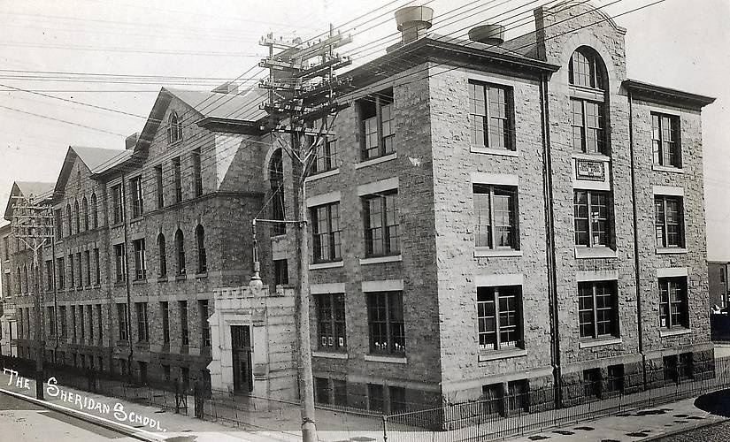 Location unknown. This pole surely seems to be pretty well weighted down given the multitude of electric distribution open wire present as well as an enclosed-type arc lamp on a long mast arm to boot ;-) The building in the background is believed to be a school, fyi... |
