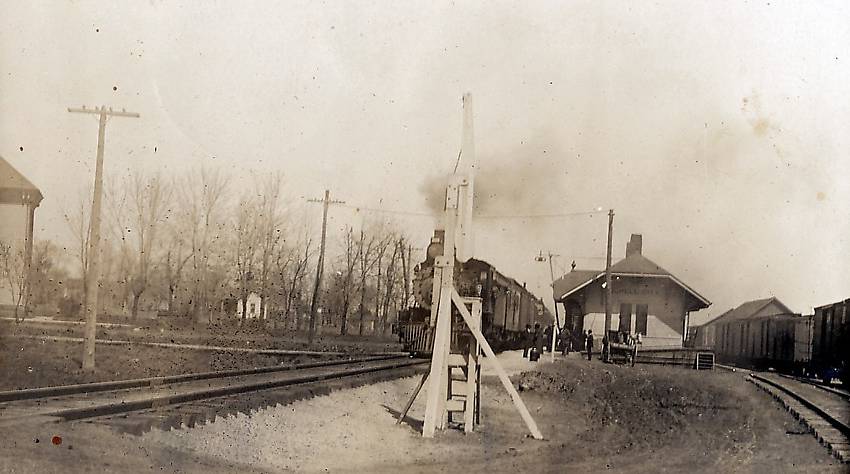 This community's local station is seen in the background with some sort of wooden apparatus in front. Any ideas what this structure was for? Perhaps for signalling? Answers will be posted here, THX! Update 09/22/12: Thanks to Mike Spadafora and Richard Turner....This arrangement was for hanging a mail bag so that a moving train could grab the bag without having to a complete stop. The arm on the pole hinged horizontally and the bag hung from the arm. As the mail car passed an employee would reach out a window and retieve the bag with a hook. Sounds like quite a manuever to me! Apparently this was a fairly common practice a century ago and scenes depicting operation this can be seen in some old movies...so I am told. Train dispatch orders and related notices were also sometimes also included within these mail bags. |
