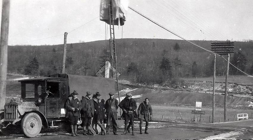 Not sure of the exact location. However here is an AT&T line crew taking a break for a moment for this photograph with traditional open wire and a lead-sheathed cable in Connecticut in 1922. A canvas-enclosed cable splicer "tent" up is seen on the upper left. |