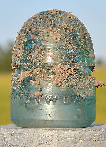 I did some more hiking and searching for insulators along the railway this afternoon again and this is what I found. It was buried 3/4 of the way down (flipped upside down) near an old tree and some bushes etc and all I had to do was gently twist it out of the ground. This CD 143 Dwight Pattern beehive is a nice aqua colour and is in great condition. |