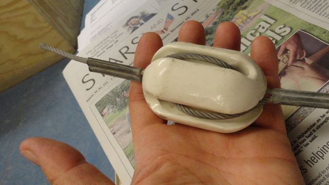 This johnny ball hung abandoned inside a high security area. It took 2 years, but I finally got permission to retrieve it. No markings unless they're hiding under the conductor. I suspect this is russian or of european manufacture, given this country's history. Interesting stranded cable and crimp ties. |