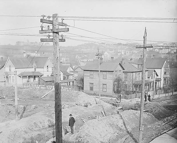 Photo taken near the present intersection of 12th and Washington Streets, Seattle. Image clearly shows the kind of electric distribution architecture used around the turn of the century; displaying crossarm construction including poletop "irons" that were for fire alarm circuits. |