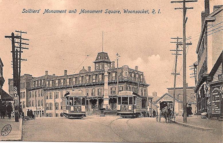The latter look like they were strung atop the 4-pin crossarm on the left. Beneath most likely were electric lighting circuits. The lowermost and shorter crossarms (on the left and right) supported heavier cables for street railway service. A tall pole in the centre background with an electric open-type arc light on top of it illuminated this busy area of Woonsocket's downtown. |