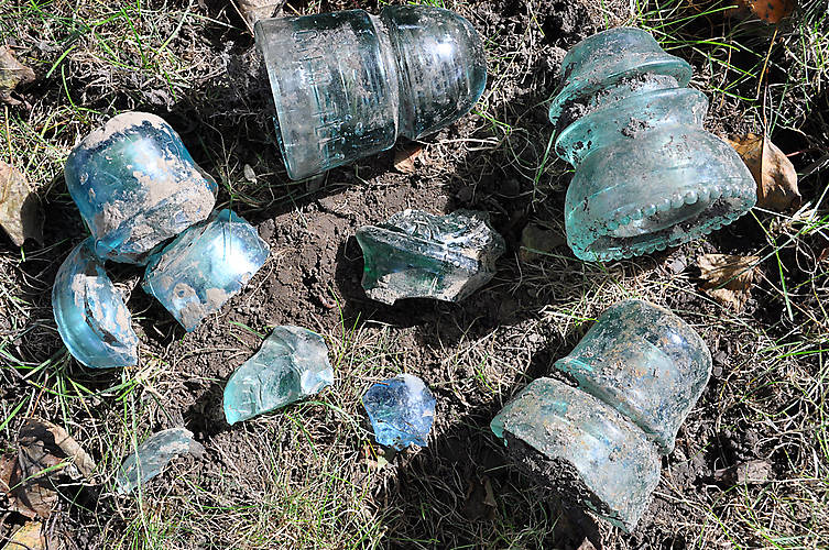 Just some insulators and broken pieces I've found in the last couple of evenings or so. The aqua 742 on the bottom right is intact, I can't wait to wash it. The other fragments to the left are from 3 separate 742s, the green shard in the middle is what's left of a 718 and the little blue piece I have no idea. The light green Dominion 42 is VNM and the aqua GNW TEL 145 has a little bruise on the backside and a couple of flea bites etc. Thanks for checking my photos out. |