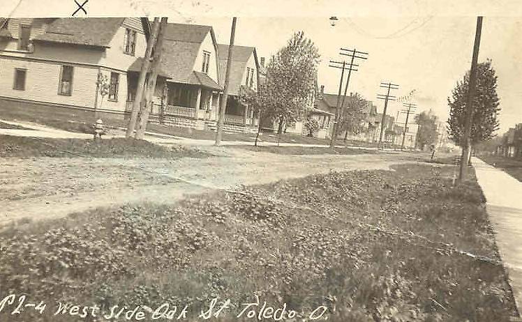 Perhaps these pole lines were being upgraded here? Or additional circuits were being added by the phone company that served this city upon a newer, sturdier telephone openwire lead? Also seen are some beautiful vintage homes built over a century ago with a nifty, smooth sidewalk (along the far right) with an enclosed-type arc street light visible in the extreme upper right-center of this image. |