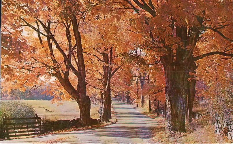 With autumn right around the corner I thought it would be neat to share this country road scene with you. I believe this image goes back to the 1950s or thereabouts. I do not know the location. Note the two-crossarm "alley arm" open wire telephone pole in the background. To me, it really doesn't get too much better than this. Imagine strolling along here on a cool, crisp, brilliant blue-sky day with autumn colors and serenity abound and surrounding you. Along with glass insulators sparking in the sunshine through the trees ;-) An example of what Heaven must be like ;-) |