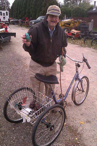 Went to a Auction, found the oldest Insulator Collector, This is Jerry and he's 92 years old. I was walking back to my truck and saw this old fellow with insulators in his rear basket peddling past the driveway and I asked where he found them. He said the RR crews were tearing down the lines a while ago and he picked them up. I asked if he had more and said yes . He has collected since his teens, but only what he found locally and didn't know there were other junk collectors out there that liked these items. He would not show or tell me his address, but he lived in town. He was impressed that I would pay for them and had so many. He said he had only a small amount. The ones he had were common but the H.G.Co CD 162 was slightly different with snow and fizzy like, not real heavy though. Common power but an unusual b hive with a top lip. Also a hem 20 with at least, what 16-20 dots on the end of the date. I just had to ask for his photgraph though, sweet old guy! |