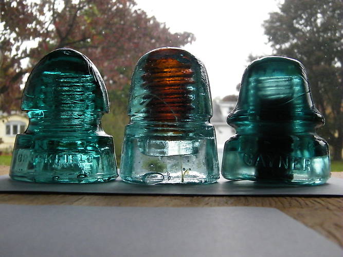 How lucky can a hunter get? The creb in the center of this pic almost got away from me. I first saw it at an auction preview that a friend of mine told be about. There was two crossarms. Mostly porcellians and all the glass were commons. I wanted and probally could have just taken this one with nobody being the wiser being there wasn't anyone around when I took my first and second preview. The auction was supposed to be around a month ago and I decided to skip it being there was a gaint flea market on the same day. That's when I came home with the crebs in this link : [id=351779035] . As much as I would have liked to of been the new owner of this/that 1870 creb I was happy enough with my hunt of that flea market day. A couple weeks later I was driving by the auction barn and decided to see if the crossarms with insulators was still there. They were not. Well they were not where they previously were where I had previewed them. During this visit there were a couple people there. One was the owner of the auction and another was one of two antique dealers that shared the same auction barn. I was told by one of those antique dealers that he was the one who won the auction but he didn't have the insulators in his shop or where he could get at them easily. I described the one insulator the best I could and he said he would but it aside for me. Last week I stoped in and he had an insulator but it was a patented Hemingray No. 40.. Guess I didn't describe it well enough the first time so I described it once again. Yesterday I made yet another visit. He had another insulator put aside that he waiting to sell me. That one turned out to be a Brookfield creb CD 133. That misunderstanding actually turned out to be in my favor. He wasn't sure that he had it stating that someone may have swiped it being it was outside waiting to be auctioned for about one month. (I didn't tell him that I thought of doing that myself) The next think he told me that he took all the insulators off the crossarms and but them in a box. He then lead me to another room in his shop where he said I was more then welcomed to look through the three boxes and one bucket of insulators he had back there. I went through the bucket first. That is where I found the Brookfield CD 149. The rest of the bucket contained nothing but Hemingray 19's and 42's and B CD 145's. I saw the bottom of the 149 and thought t was just another of the B beehives. At that point I was no longer worried about whether I ever saw that Brookfield beehive creb I was looking for, I was just about ready and in fact paid for the 149 along with the most destorted Gayner CD 162 I had ever seen. That's the third insulator in my pic of course but not the end of this story. I was once again lead back into that back room where I was shown yet another box of insulators I had not sorted through. Low and behold!! You know the whole story now, right? The creb turned out to have a nice white stone and a skinny milk/snot worm that is about 10 or more inches long if it were to be unravaled. I like the orange resin that two owners ago must have put on the wood pins. I think I'll keep it like that even though it is altered. |