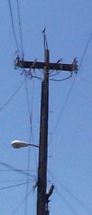 This was a real find after seeing pics in the book concerning Oroville's history. Note the bracket at the top of the pole. This carried the Fire Alarm Circuit. In Tracy all our Fire Alarm wires were run below the secondary lines.