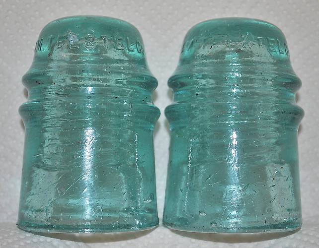 I purchased this interesting pair at an auction last week in a box lot of glass and porcelain insulators. I've never seen a crown-embossed "AM TEL & TEL Co" CD 121 before, let alone two.