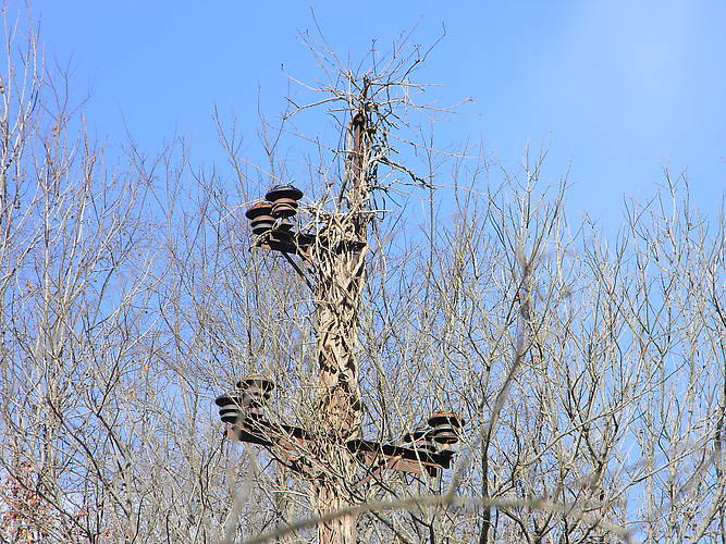 This tall pole is one of two remaining from a line to a long gone cotton mill.
