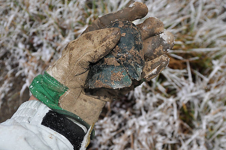 Am I still lucky for finding another busted up threadless insulator or am I really unlucky? It was a bulldozer and large rocks that crushed this dark green CD 742.3 which otherwise appeared to be a real nice one. I found it on farmland that's been slowly under development just outside of town where the Grand Trunk (CNR) crosses over the property. There once stood an old house and barn here in fact I know the owner's son and he remembers finding insulators along the railway when he was a kid. I also found a black glass dome shard from a CD 740 while I was here. |
