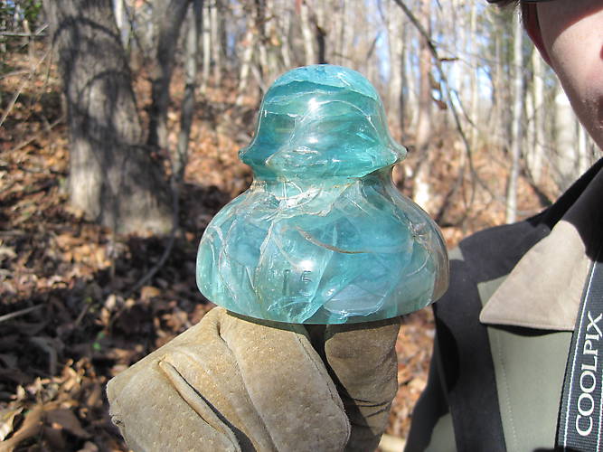 Here is a nice crackled CD 287 Jeff found along the line in the woods. We saw some burnt trees not too far from where he found this, but it could have been struck by lightning while on the pole also?