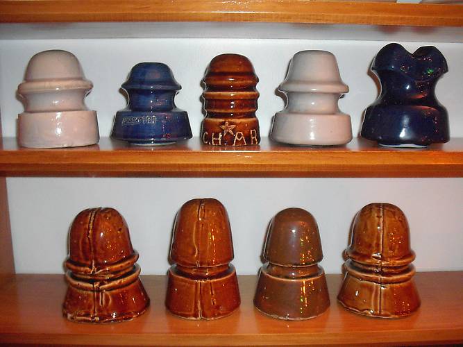 More low voltage cables and telephone types. The blue Findlay signal is a sweet one. I do like the crude signals on the lower shelf. Several of these pieces were purchased at the wonderful Mid-Ohio show in Springfield, Ohio. Photo posted in memory of Steve Blair. Rest in peace. |