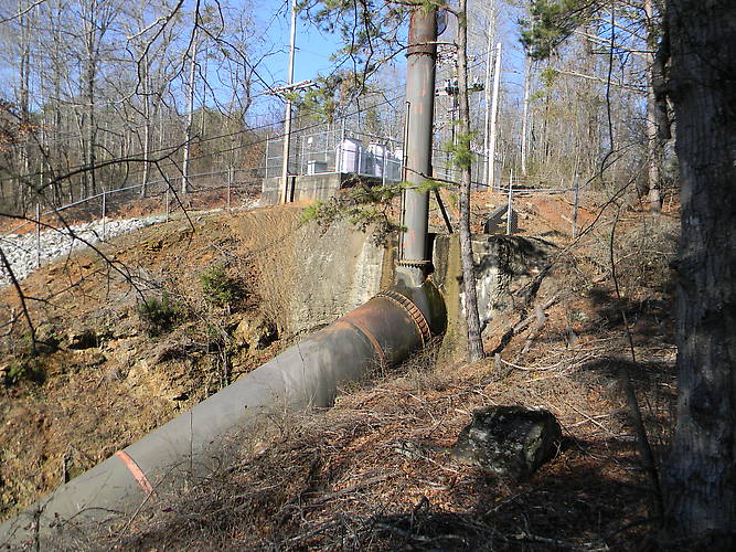 From here the penstock runs downhill to the Coneross powerhouse. The large tank is a surge tank. The concrete slab for the substation was poured over the original brick transformer house foundation.