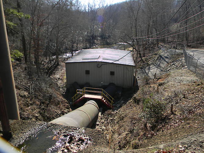The penstock splits three ways to the turbines inside the powerhouse, running the generators.