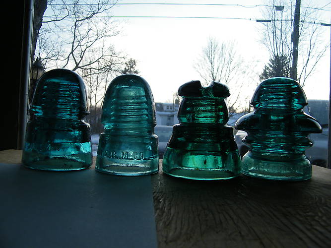 Been busy working my connections made online. This pic and the following four will show what my hunting has yielded. Enjoy. Sorry my pics are on the dark side. I get up early and when I take them there seems to be enough light coming through my garage window. You will probally see a few of these insulators in the for sale album soon. I'd even be willing to do trades if you have what I want for my collection. I have most Hemingray insulators made in Hemingray Blue but not all. My Brookfield blotout toll collection could also use some upper level colors made such as olive greens and olive ambers with smooth or sharp drip points. Let me know if you are interested and maybe we can work out a deal. Left to right in this pic : CD 145 B No44/7 Very close to Hemingray Blue in color. VNM CD 145 NEGM Co. Light Aqua Tall stretched out version. CD 210 Postal Aqua with Amber Swirls CD 202 Fred Locke Pic one [id=362052160] Pic two [id=362052641] Pic four [id=362053814] Pic five [id=362054349] |
