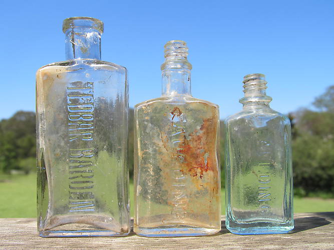 On the left is a very dark straw TEDBAR BARDEN bottle, followed by two FAULDING bottles (one clear, one light aqua).