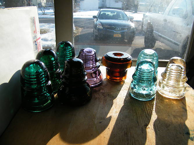 Here's the first group of the second round of insulators purchased from an online connection I made when I won a insulator lot of four and five at eBay. Didn't pay a heck of a lot for either of those lots and not much more for all these and the last nest I posted about a month ago. Included in this deal is a milky wormed American Insulator Co without any embossing and my first ever CD 1070 spool (think that is what it is called) in orange amber. Not in the best shape but at least all the embossing except U.S.A. is present. The CD 162.4 1678 is a very light straw almost clear cone. Another first for me is the B CD 152 in a dark olive green with plenty of amber within. Guess you could call it blackglass. And of course yet another of the most common purple insulators I know of other then the WGMCo. CD 121's. Couple nice Brookfield Creb beehives and a 133. |