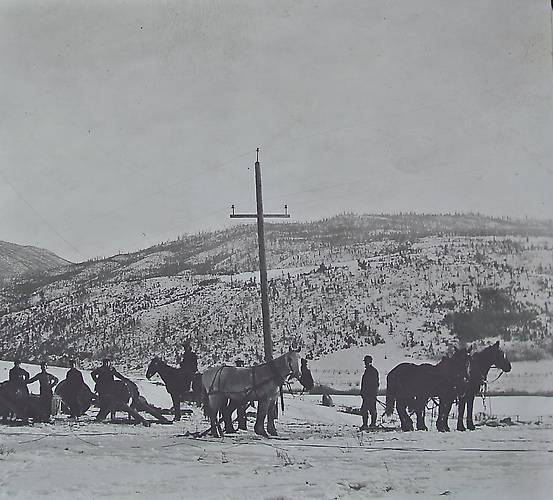This is a picture of the Madison line getting built. It went from the madison dam near Ennis, Montana to Butte, Montana. It used #1 provo insulators [id=188408685] and the arm was mortised through the pole [id=188408512]