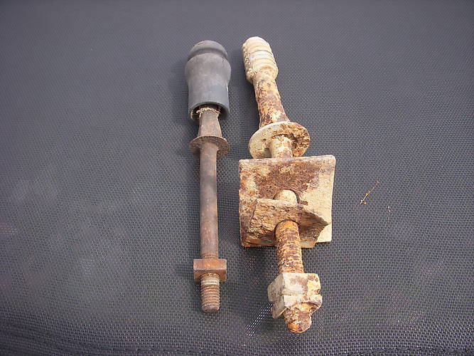 Found this R-5 whlie walking the CSX line here in Nortonville. First one I've found with the pin still attached and was wondering if the pins are hard to find or maybe collectors just leave them and just remove the insulator. Picture shows another old pin for size comparison. Thanks to Dave Dahle for following info : It's my understanding that the R5 was made to fit the steel shank of a regular wood / steel pin after taking off the wood cob. |