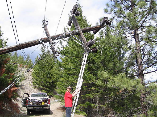 Hello ICON.I found this lost photo taken in April 2008.That is my mentor Bob Scafe at the ladder. This pole had rotted at the base and went over. The ladder was too short here. We went ahead and cut the wires and the pole dropped to ground level. We did pick it clean. By the way, we did qualify the line as dead. |