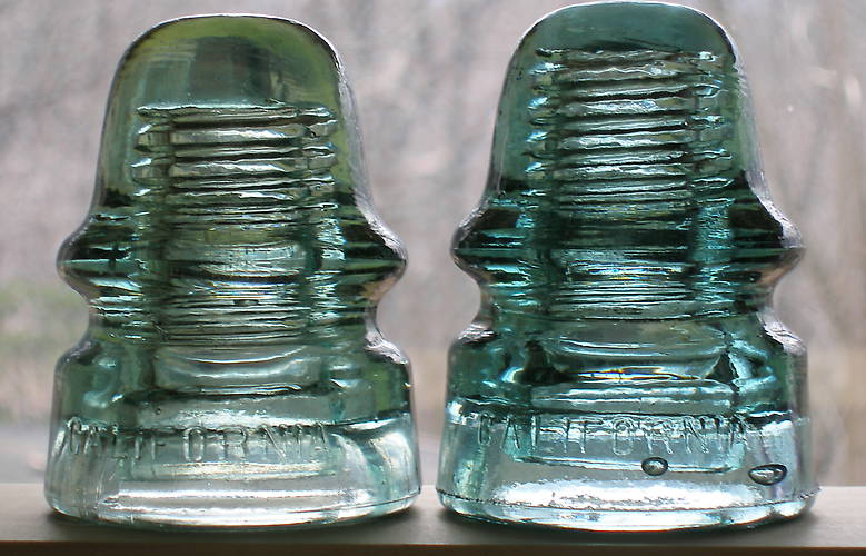 Two different shades of green on these two pieces. Ones a Sage and the other is????.Very unique color exclusive to the California glass house. Both in great shape with one having a little rust mark in the wire groove from years of service. Asking $28.00 shipped, which averages about $8.50 each after I pay the shipping to your residence. Not bad for this good lookin pair of signals. |