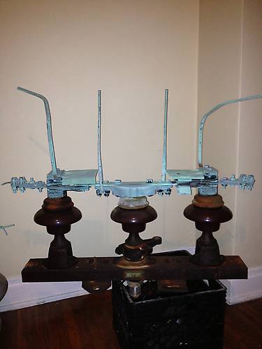 The railroad company was wrecking out their transmission/ signal lines and one of the poles had 3 of these on top. They are made by Delta-Star and rated at 400 amperes for 7,500 volts. This thing weighs a ton! Really need looking switch. The pole it came off of had a date nail in it from the 1930s. |