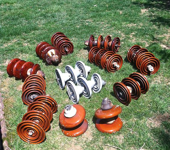 Here are more bells I picked up from the 138kv re-insulating project. The brown ones are Thomas's from 1948 and Lockes from 1950 (one of which has a massive flashover), The orange ones are OBs from 1948 and 1951. The 10" grey bells are A B Chances from 1969 and the 9" bell is a Locke from 1987. The white dots on them is the galvanizing paint from the tower. |
