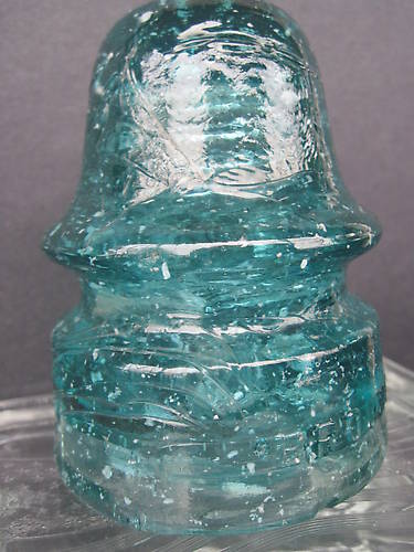 LIGHT AQUA .LOADED WITH SNOW. THE ONLY DAMAGE IS A SHALLOW 1/2 " FLAKE TO THE UNDERSIDE OF THE UPPER WIRE GROOVE AN A 1/4" FLAKE TOTHE EDGE OF THE BASE. THE GLASS IS FULL OF SNOW AND GOBS OF WHITE SNOT IF YOU WILL.THE PHOTO DOES NOT DO IT JUSTICE.tHE BEST PART OF THE INSULATOR ISTHE INPROPERLY FORMED PIN HOLE. THERE IS A VOID IN WHERE THE SCREWS START.AN INSIDE HOLE IF YOU WILL. AND FOR ADDED CHARACTER THE ENTIRE SURFACE IS COVERED WITH SWIRLS AND LINES IN THE GLASS. IF YOU LIKE JUNKY INSULATORS YOU WILL LOVE THIS ONE !!! $ 110 SHIPPED USA. CANADA EXTRA. NO PAY PAL, WELL HIDDEN CASH, M.O., CHECKS |