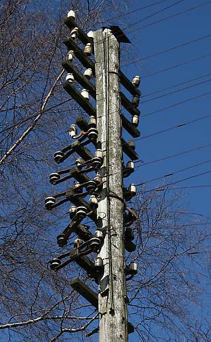 This pole stands next to an old bridge and is full of shackles mounted on double clamping brackets.