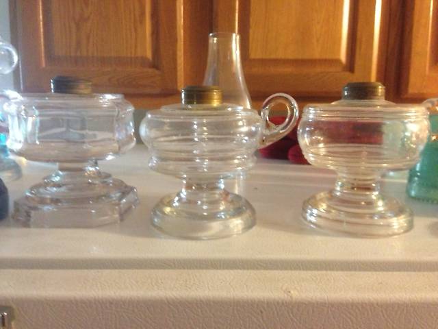 left to right: octagon lamp. $100. thermometer bowl lamp. $80 double groove lamp. $60. all are in good condition with only minor base flaking. other than colored lamps, and the tear drop family of lamps, the footed finger lamps are my favorite. the octagon is a nice heavy solid lamp and the hardest of the 3 to find. it can also be found in several sizes in stand version. ditto for the second lamp. I have a finger version of the double groove, but no stand one at current time. prices are listed above. shipping is additional. lamp can be delivered to Columbia city in week, or the National. will post additional individual pic. any questions, please ask. |