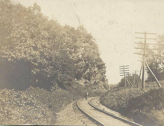 This looks like a pretty old 6-pin telegraph line, perhaps built in the 1890s and probably outfitted with crown-embossed CD 145 Brookfields (aka CREBs). Owing to the rather decrepid appearance of this line and the fact it probably had iron wire lines going back (goodness knows how old...) lines like this were thoroughly rebuilt starting around 1910. The CD 145 and CD 151 (double-petticoat) insulators were "recycled" and thus resused as well as usable other line hardware such as pins, crossarms and braces. With Western Union, only double-petticoat insulators were installed on their upgraded lines. Beyond this, cedar poles were the replacements...at least here in the Northeast. Boy...did a lot of them last a long time!! Crossarm construction was of the 10-pin design and the line wire made of hard-drawn solid copper. Pins had metal cores with wooden cobs. These were introduced by the mid 1890s and I am sure a lot of them were re-used during Western Union (and other telegraph company) line-rebuilding projects of the early 20th century. Many of these telegraph lines remained in service through many decades, well into the 1970s. |