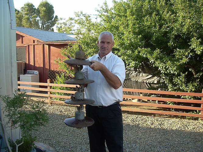 Today was my Monday and Mondays for me are in the office a full day. I hate it and decided to stretch my feet on the way home. I stopped in an area close to the hwy were the line crosses and in just a few minutes found this string of four. I first found a long piece of 7 strand copper conductor and thought I better take a closer look. This set was under the bushes and all tied together with copper wire. I was not aware of four Thomas plates used for a single conductor? All are MINT and two a nice drippy light glaze. |