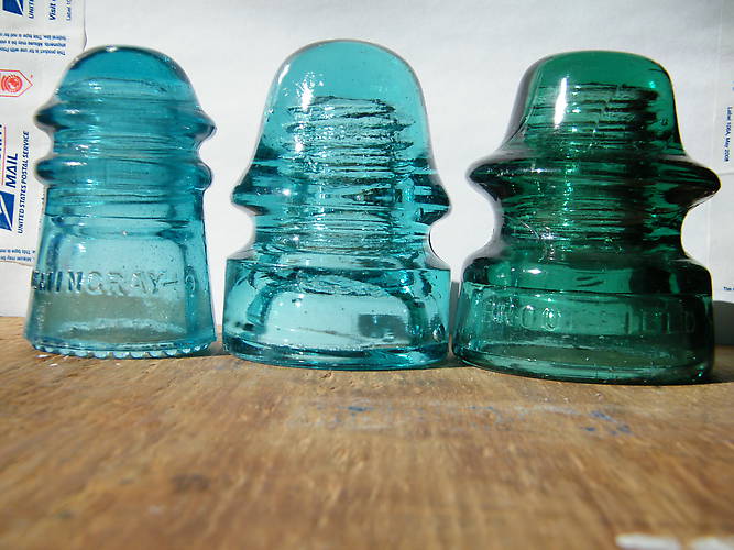 Didn't find any insulators worth buying at the Revena New York Yard Sale Day. On the way home I stopped by an newly opened antique shop (about 5 miles south of Revena) located in New Baltimore NY. Took home these three pieces. Left - Fizzy Hemingray-9 CD 106. Center- Crown Embossed Brookfield CD 134. Right- Green Brookfield CD 164. I'm curious just how long this new antique shop will remain open and if I'll ever find any other insulators there if I do stop in for a look. Most other places in the same area rarely have any worth while insulators. However, I do upon a good number of revisits find one I'll bring home with me. |