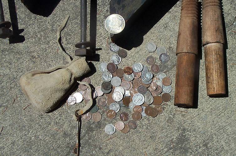 A bag of old coins ? ! ? I was up in the rafters of a long abandoned 1899-1900 era transformer house near an old abandoned mine in the middle of nowhere in central Utah... I found some very unusual wood insulator mounting brackets and decided to climb up into the rafters of the place and recover the brackets . Wile up there I noticed a very dusty and bird dodo covered leather bag with an old key attached tucked away on top of one of the beams . I took it down with me along with the aforementioned recovered pins and brackets and emptied the bag on to the floor and to my amazement it was full of old American coins including a nearly new looking silver dollar from 1921, Indian head pennies, buffalo nickels, late 1890's "V" nickles, a silver dime and quarter as well the newest coin was a shiny new looking 1958 penny. I have no idea how long the bag had been there or who put it there but it was about the strangest thing I have ever found in an old abandoned building of this nature it was stashed in a place that would have been near bare 16kV primary voltage lines if the station was still in service when the bag of coins was stashed there.... ??? It is amazing how attractive and artistic American coins use to be...somehow we have lost something as a culture.. no wonder people collect them! |