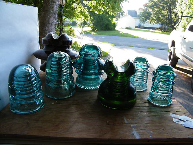 Will try keeping my descript short and sweet. These insulators plus about the same amount I already given away came from a Icon forum notice that someone had insulators for sale up in New York State. That notice was more then a month ago posted by Hemingray Dan (Thanks!) . I was only one of two Icon members that contacted the seller whose email address was provided. That was so long ago for my burnt out insulator memory I had forgotten all the insulators that were in the pics I was sent. Based of those pics I placed my offer for all insulators. Was told another person had offered more and was supposed to pay for them the first week in June. Was asked if I wanted to be notified if that deal fell through and of course I wouldn't say no to gems and jewels unless I lost my possessed mind. You already know the rest of the story but I am not done at all with mine and your tale. Didn't think I would be collecting any insulators this past weekend being I didn't feel well on account of another bug or allergies. Anyhow, Saturday evening I checked my iPhone and was surprised by the sellers message that if I was still interested in coming for the insulators I could. Wasn't very sure whether the 100 plus mile trip one way was worth what awaited but I'm starting to wonder now. Below is a list of CD numbers of only the pices I kept: 2 CD 106's. 1 patented Hemingray No.9 and a Star CD 143 CNR CD 145 Brookfield Creb. (didn't have this one in my growing collection. Straight up #7 on rear crown.) CD 202 Patented Hemingray #14 Spaceship CD 252 No 2 Cable. Nice shade of either dark yellow green or Olive Green with amber swirls. U-954A No Name (embossing) Not sure if that is the correct U#. Wil ask and post pics and description in Question/Asked album soon. Niether Jack Tood or Elton Gish have the exact diagrams with measurements this two part is. |
