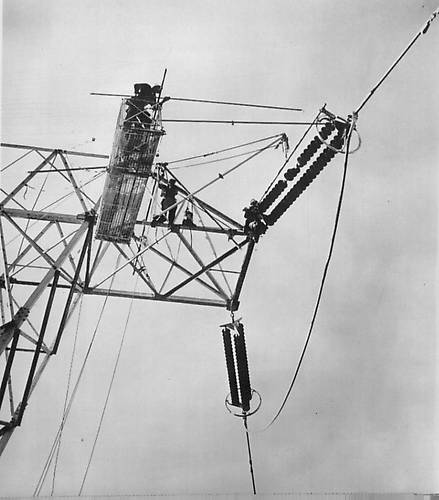 I am not sure where this image came from but I thought I'd share it with you. It is of lineworkers doing a high-wire act on a Bonneville Power Administration (BPA) transmission tower somewhere in Oregon. Such lineworkers are a rare breed and certainly are to be commended for their dedicated service, no matter where and when so that electricity will continue to serve our homes and businesses! |