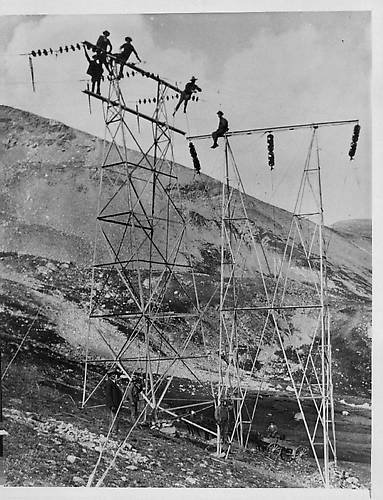 Here is another very nice image that I have on file with no idea where it came from...but I thought I would share it with you just the same... It shows early-day transmission lineworkers installing suspension insulators on a new transmission line that allegedly was in the Argentine, Colorado vicinity. Boy, what hard work! And I bet the weather was really hot as this line was being assembled back then.... |