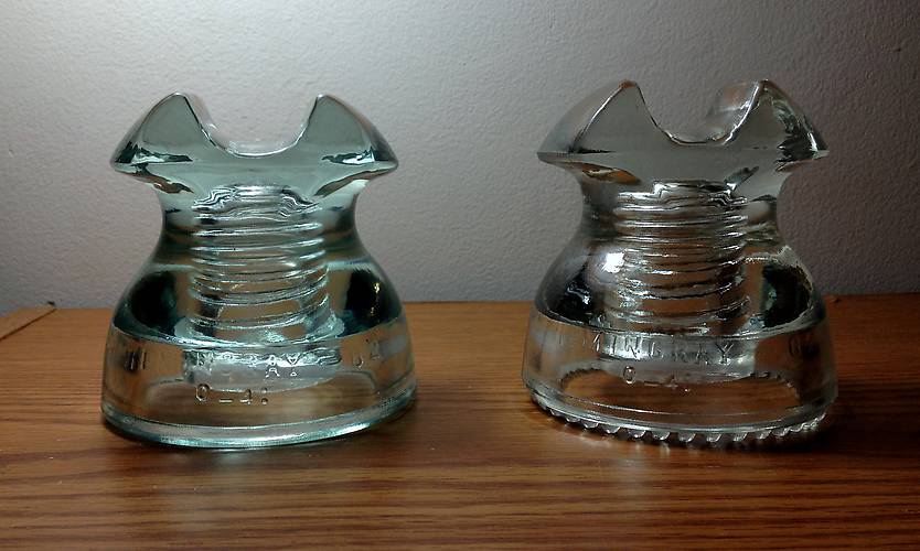 CD 252 [100] Hemingray - 62 SB, in an unusual and pretty heavy ice aqua (color depicted is lighter than actual). Small part of a ping on an ear, and inside pinhole roughness - $15 CD 252 [090] Hemingray -62 RDP, in a crystal clear. No damage visible - $6 Shipping to lower 48 should be around $9, and combine on shipping with other insulators. PayPal in gift mode, check, money order, well concealed cash. Contact at midmoac@gmail.com |