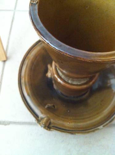 Here is a view of the bottom of the M-2796. The tan glaze did not completely cover the bottom. The glaze looks burnt in several places with microbubbling.